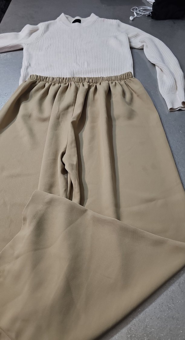 Bej renkli, pilili ve bol kesim kadın kumaş pantolon. Elastik bel bantlı, yumuşak sentetik kumaştan, günlük kullanıma uygun minimal tarzda.