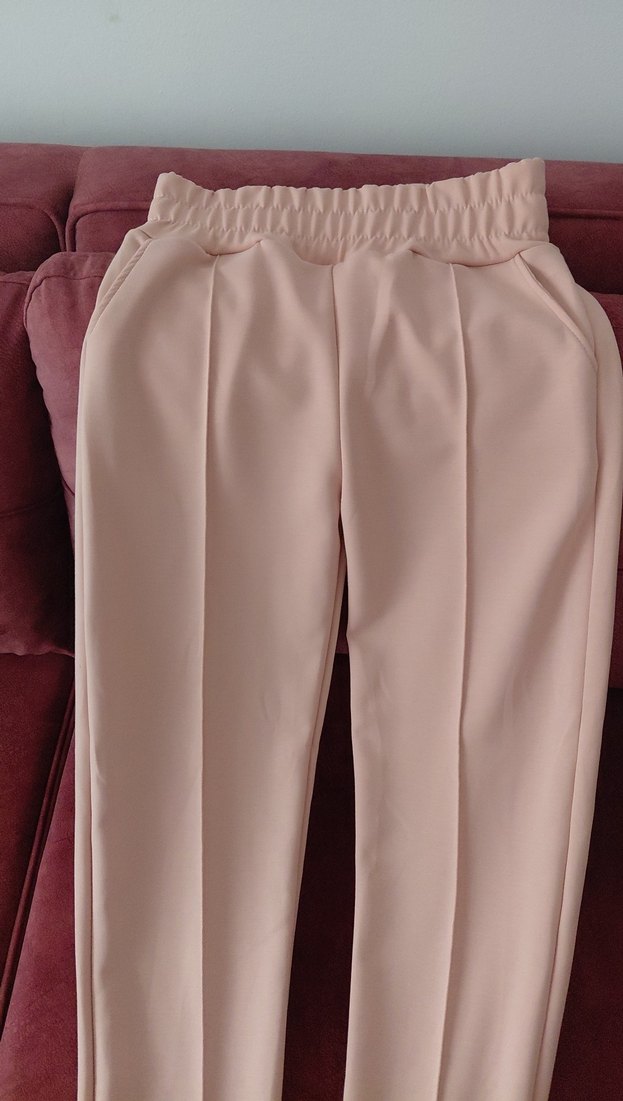 Bej renk, pilili ve midi boy kadın kumaş pantolon. Rahat kesim ve yumuşak sentetik kumaştan, ofis ve günlük kullanıma uygun.