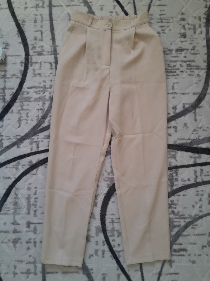 Bej renkte, pilili detaylara sahip kadın kumaş pantolon. is yerinde giymek için almıştım kullanmadığım için satışa koyuyorum beli lastikli kemer takılabilir boyu 94 cm isteyene uygun fiyattan vereceğim