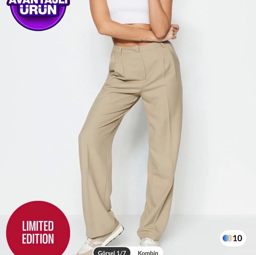1-2 kere giydim sorunsuz Bej midi uzunlukta, regular fit kadın kumaş pantolon, sentetik dokusu ve minimal tasarımıyla ofis için rahat ve şık bir seçenek sunar.