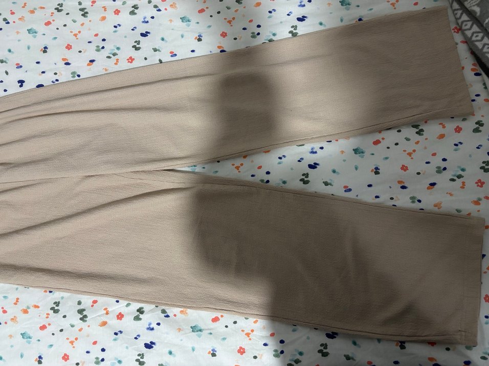Bej renkte, pilili ve bol kesim midi uzunluğunda kadın pantolonu. Yumuşak sentetik kumaştan üretilmiş, günlük kullanıma uygun minimal tarzda. Yazlık efil efil bir pantolon, rengini kendime yakıştırmadığımdan satıyorum yalnızca bir kere giydim.