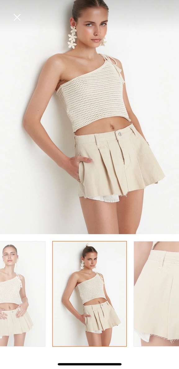 Bej renkte, pamuk kumaştan, pilili ve bol kesim kadın mini etek, günlük kullanıma uygun modern tarzda.
