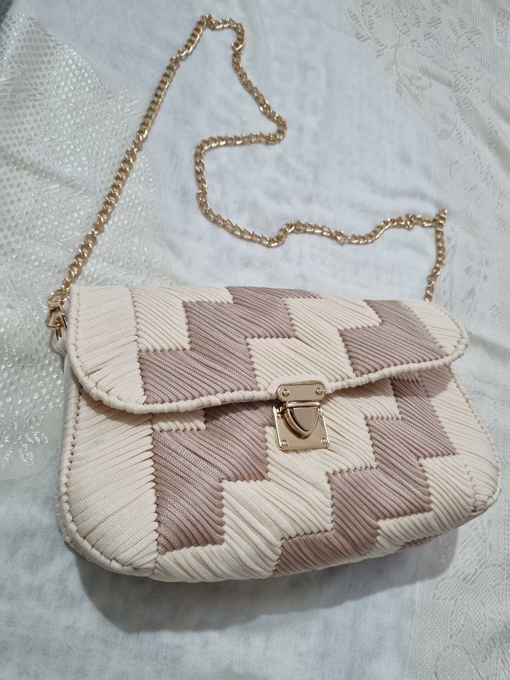 Bej pilili sentetik kumaştan, nakışlı zigzag desenli kadın omuz çantası. Altın renk zincir askı ve toka kapama bulunur. Günlük kullanım için uygundur.