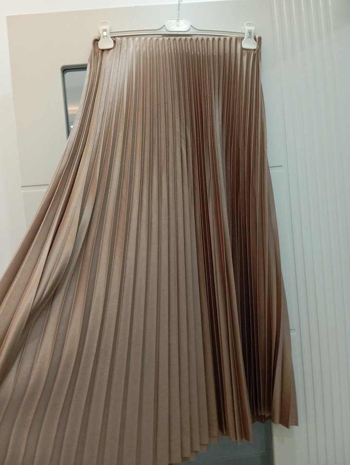 Hafif bej renkte, pilili tasarıma sahip, bol kesim uzun etek. Pürüzsüz sentetik kumaştan üretilmiş, günlük kullanıma uygun çağdaş Paris tarzı hiç giyilmedi