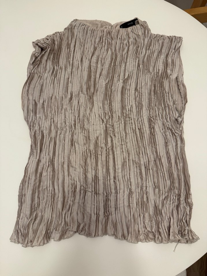 Bej-gri tonlarda, keten kumaştan, pilili dokulu, kayık yaka ve kolsuz, uzun kesim, dar kesim kadın bluz. Mango m beden.