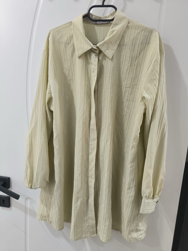 Bej renkte, pilili detaylara sahip keten kumaştan, uzun kollu, yakalı ve midi boyda rahat kesim kadın gömlek. Minimalist ve desensiz tasarımı ile ofis kullanımı için uygundur.