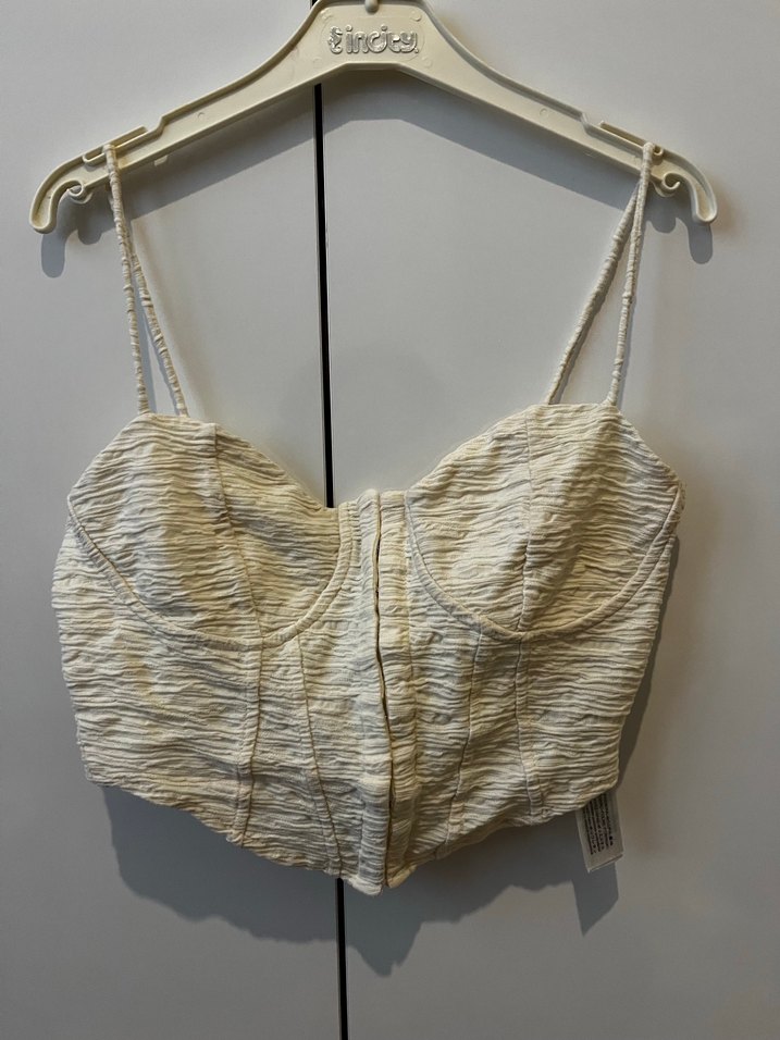 Bej renkli, keten kumaştan yapılmış, pilili ve ince askılı straplez büstiyer. Mini uzunlukta, bohem ve Paris tarzını yansıtır.