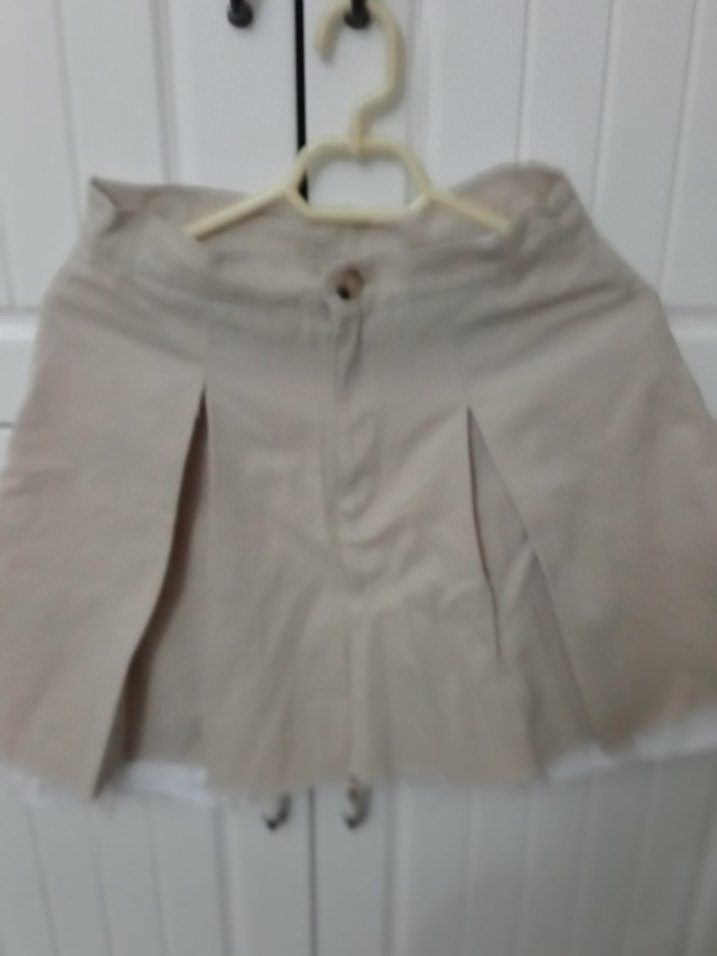Bej renkli keten mini etek, bol kesim ve pilili detaylara sahiptir. Günlük kullanıma uygun rahat bir sokak stili parçasıdır.