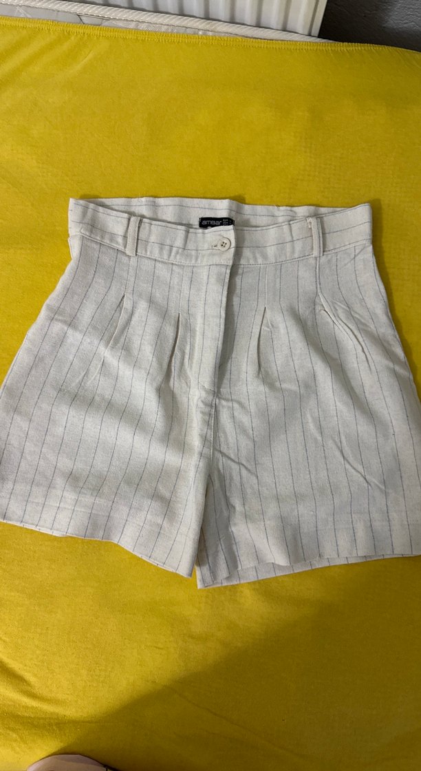 Bej renkli, keten kumaştan yapılmış, pilili ve bol kesim mini şort. Günlük ve rahat sokak stili için uygundur.
