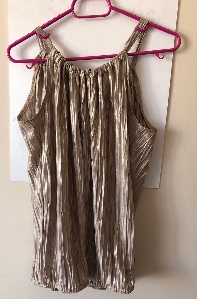 Kendinden pliseli ve metalik yansımalı şık bir kumaşa sahiptir. Halter yaka formunda, boyundan askılı ve dökümlü bir kesimi vardır. Etek ucu hafif lastiklidir. Birkaç kez kullanıldı. Hiçbir kusuru yoktur.