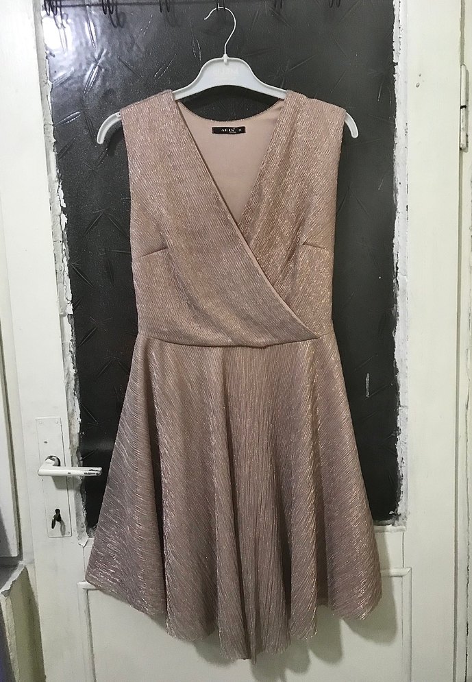 Bej Pilili Kolsuz Mini Abiye Elbise