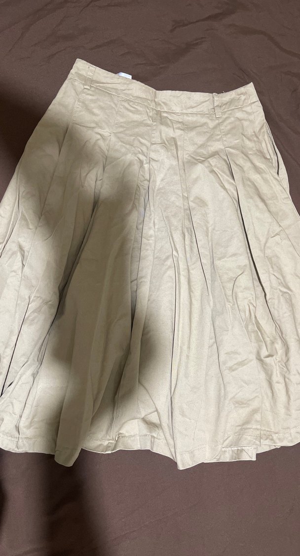 Bej renkli keten kumaştan, pilili ve bol kesim hamile eteği, günlük kullanıma uygun sade bir tarz sunar. koton marka