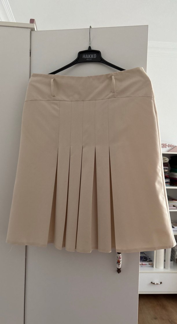 Bej renkli, pilili ve midi boy hamile eteği, ipeksi kumaştan ve normal kesimlidir. Desensiz, ofis için uygun sade tasarıma sahiptir.