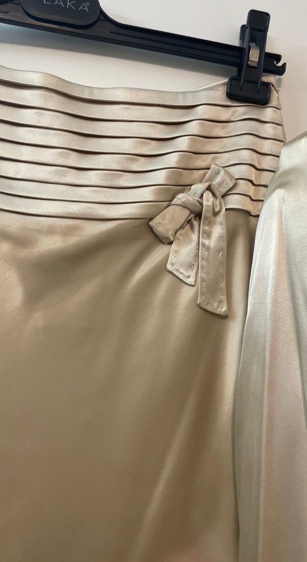 Bej renkli, pilili tekne yaka ve ince askılı, vücuda oturan kesime sahip midi kadın abiye elbisedir. Modern klasik tarzıyla düğünlere uygundur.