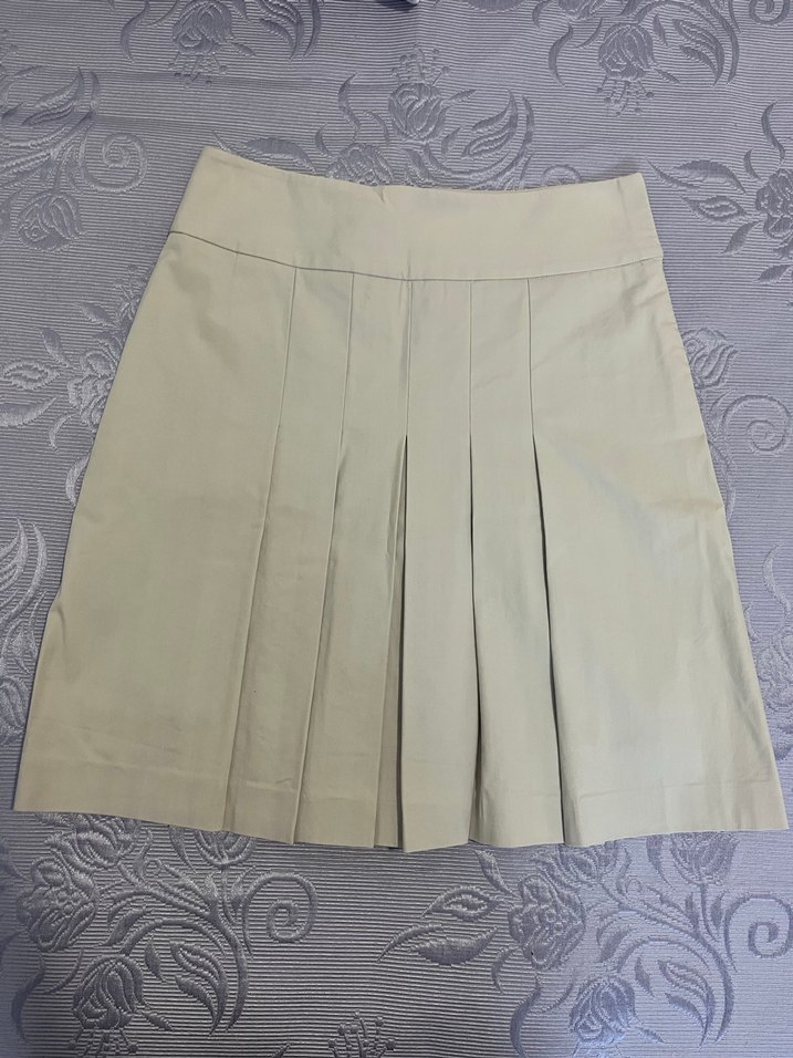 Bej renkli, pilili midi boy kadın etek. Sentetik, düzgün kumaştan, vücuda oturan kesime sahip. Ofis ve sokak stiline uygun, minimal tasarım. Özel dikim