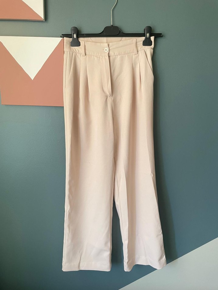 Bej renkte, normal boy midi kadın kumaş pantolon. Pilili tasarımı ve ipeksi dokusuyla ofis için uygun, minimalist ve normcore tarzında.
