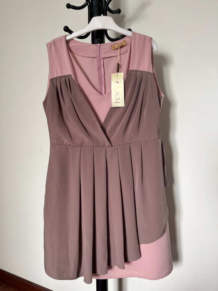 Kolsuz, V yakalı, pilili detaylara sahip bej midi elbise, rahat kesimiyle modern klasik tarzda ofis için uygundur.
