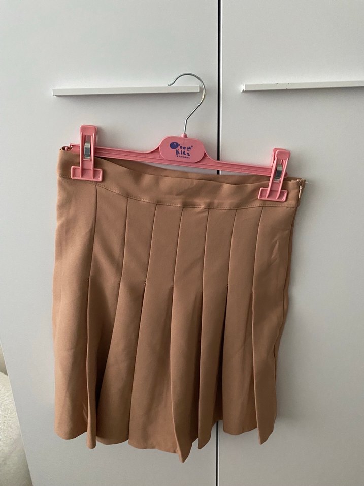 Bej renkte, pilili ve mini boyda mini etek. Yumuşak sentetik kumaştan üretilmiş olup, sade ve günlük sokak stiline uygundur.