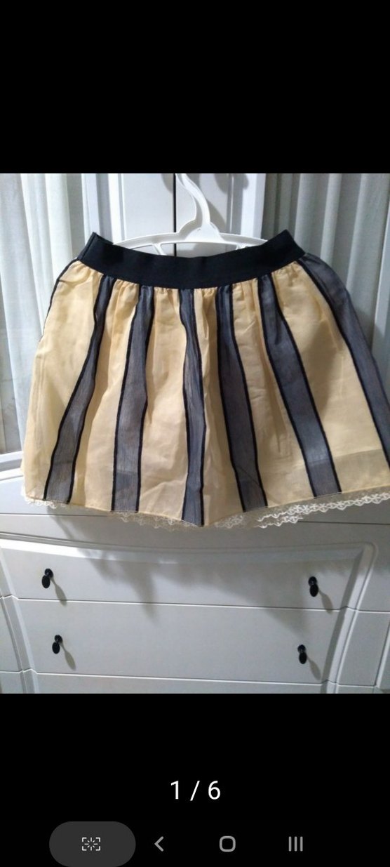 Bej renkli, pilili ve bol kesim mini etek. Sentetik kumaştan, siyah dikey çizgilerle bohem tarzda, günlük kullanım için uygundur.