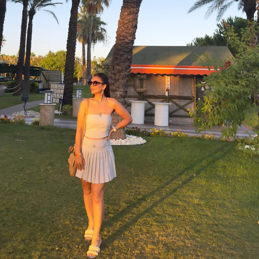 Bej renkli, sentetik kumaştan pilili ve bol kesim mini etek ve büstiyer.Desensiz ve açık tonlarıyla günlük dış mekan kullanımı için uygundur. etek şortludur.