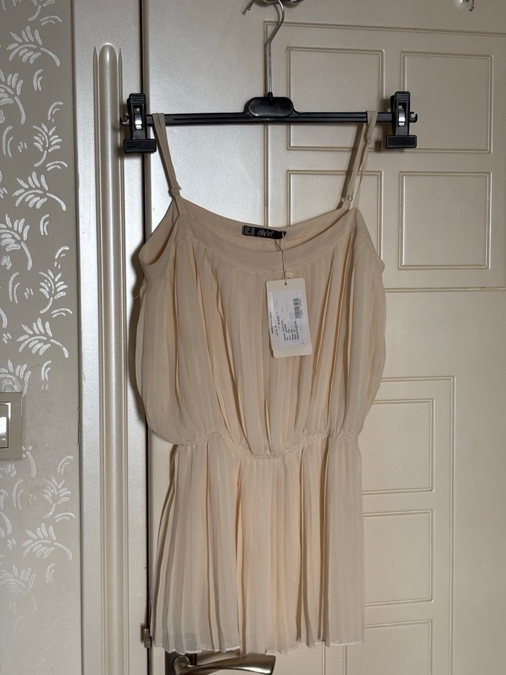 Bej renkli, pilili ve straplez yakalı mini elbise, bol kesimiyle günlük kullanıma uygundur. ✨ şık bir bluz hiç giyilmedi