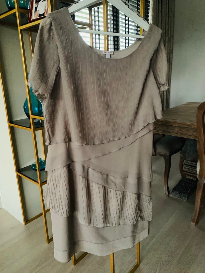 Bej renkte, keten kumaştan, pilili detaylara ve bol kesime sahip elbise, ipek krep gibi kumaşı var. Kısa kollu, yuvarlak yakalı, midi boyda, ofis için uygun bohem tarzda.marka Alfa Beta.