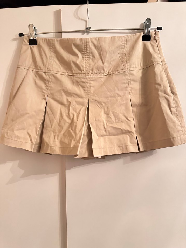 Bej renkte, keten kumaştan yapılmış, pilili ve dar kesim mini etek. Sokak stiline uygun, dış mekan kullanımı için ideal.