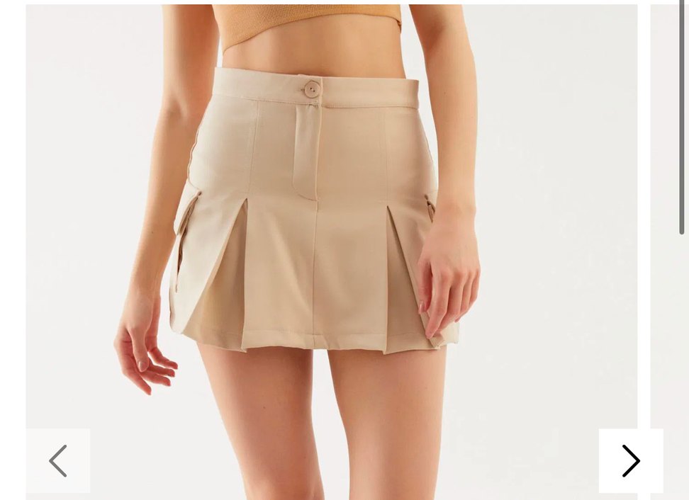 Düğmeli ve pilili detaylara sahip, fit kesim bej şort etek. Pürüzsüz sentetik kumaştan üretilmiş, günlük kullanıma uygun.