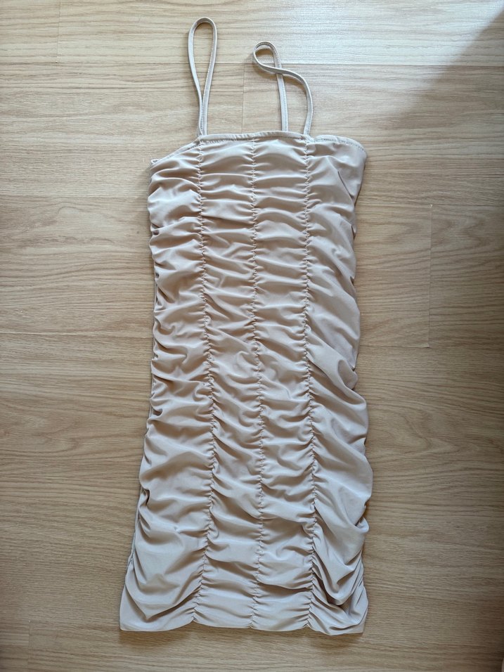 Bej renkli, ince askılı, pilili detaylara sahip straplez midi elbise. Vücuda oturan kesimiyle minimalist ve şık bir görünüm sunar.