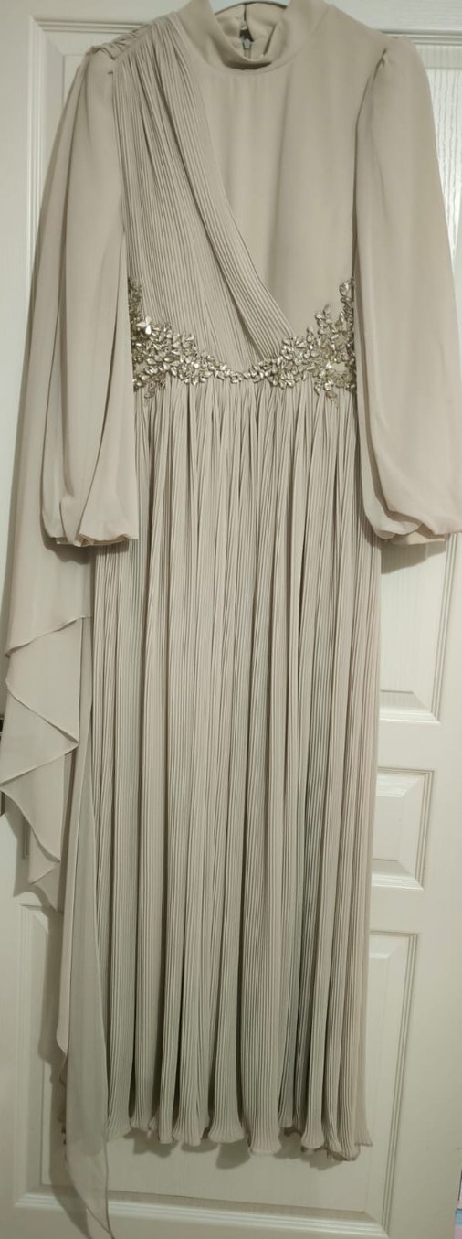 Bej renkli, pilili ve uzun kesim olan bu abiye elbise, salaş bir yapıya sahiptir. Kayık yaka ve askılı kollara sahiptir, düğünler için uygundur. pazarlık vardır