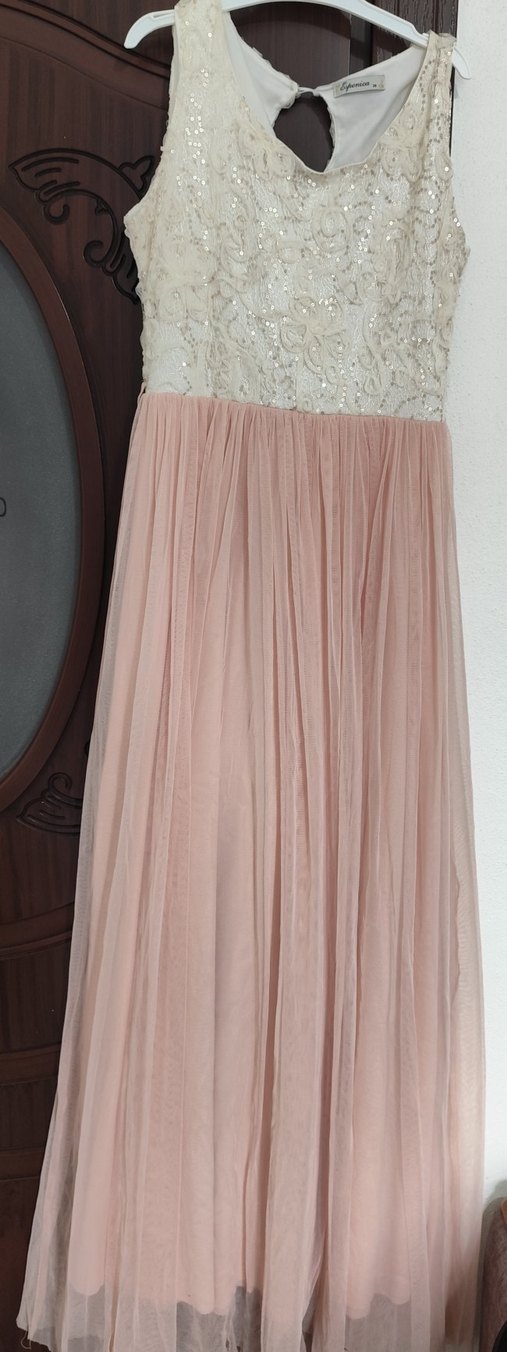 Kolsuz ve straplez bu abiye elbise, pastel bej renginde pilili ve bol kesimdir. Modern klasik tarzıyla düğünler için minimal ve şık bir seçimdir.