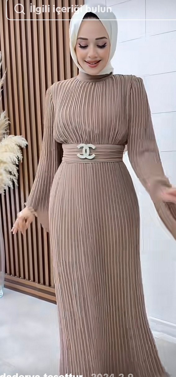 Bej renkli, pilili detaylara sahip uzun elbise. Yüksek yakalı, askılı kollu ve rahat kesim. Yumuşak sentetik kumaştan, günlük kullanıma uygun klasik ve modern tarzda.