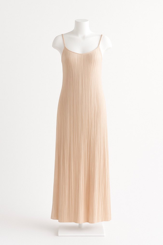 Bej renkli, pilili uzun elbise, ince askılı ve satenimsi kumaşıyla klasik ve modern bir şıklık sunar. Marka temsilidir