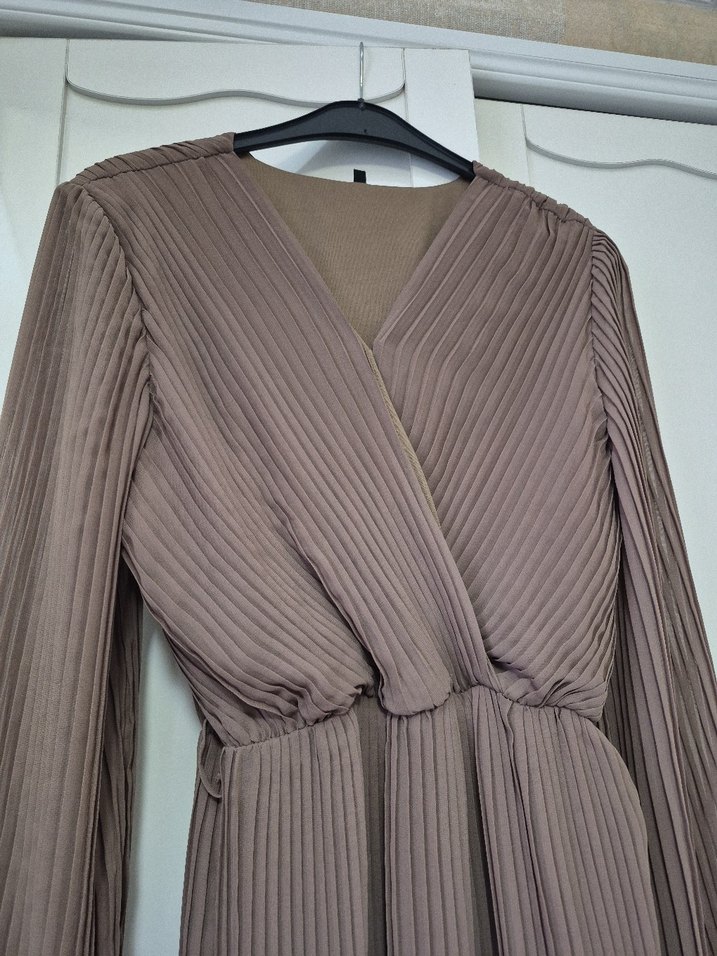 Bej renkli, V yakalı ve uzun kollu pilili uzun elbise. Sentetik kumaştan üretilmiş, günlük kullanım için uygun, düzenli kesim ve çağdaş tarzda.