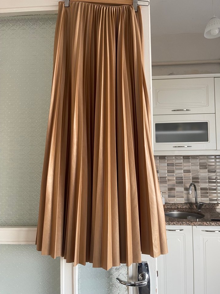 Bej renkli, pilili ve parlak görünümlü uzun etek. Sentetik kumaştan, düzenli kesim ve klasik şıklık sunar. Ofis için uygundur.