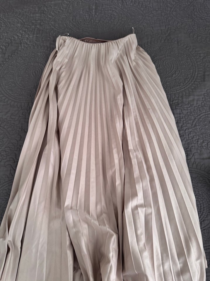 Yumuşak kumaştan, pilili detaylara ve bol kesime sahip uzun bej etek, bohem günlük stil için uygundur. Henza merkadır Standartır saten gorunumlu çok değil fotoğrafta gözüktüğü gibidir defosu yoktur çok az giyildi