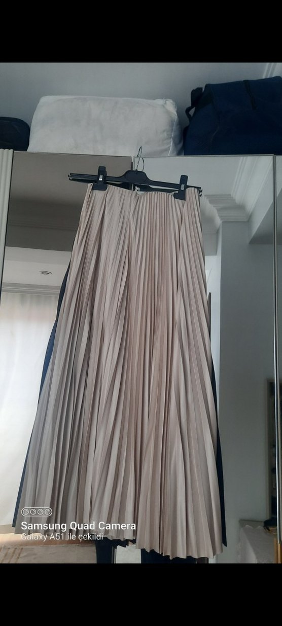 Bej renkli, pilili ve bol kesim uzun kadın etek, yumuşak sentetik kumaştan üretilmiştir. Günlük kullanıma uygundur.