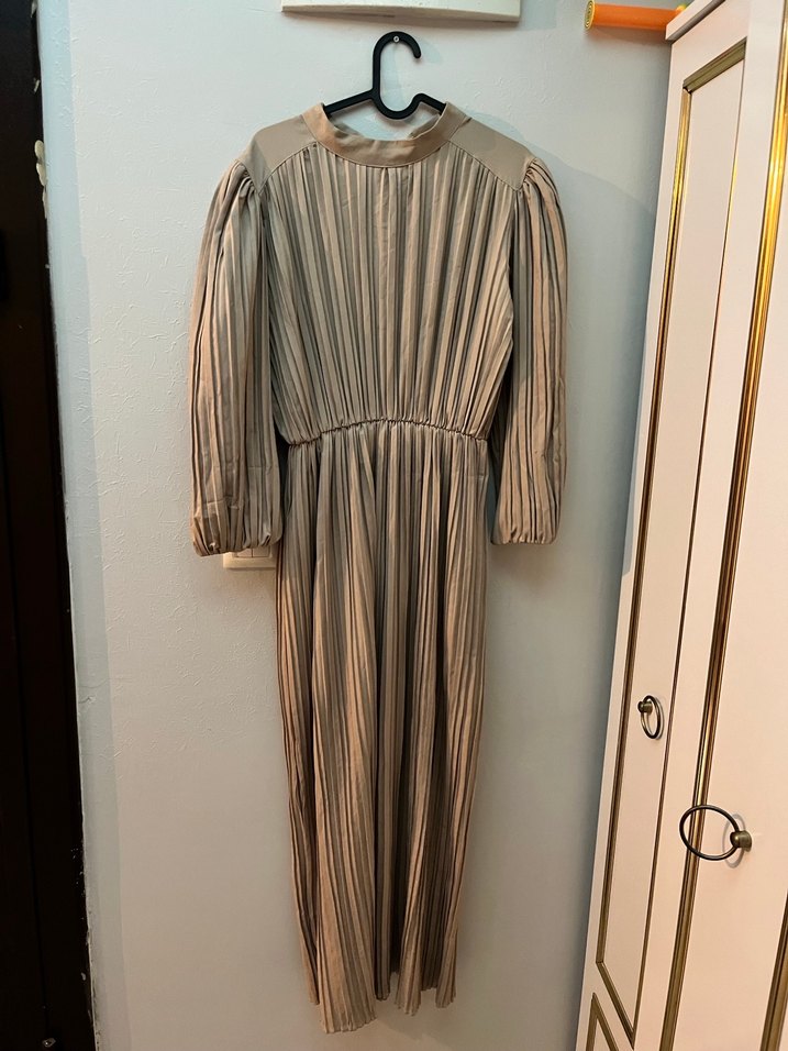 Bej renkli, keten kumaştan yapılmış, pilili ve uzun kollu, yüksek yakalı uzun elbise. Modern klasik tarzda, ofis için uygun, bol kesim.