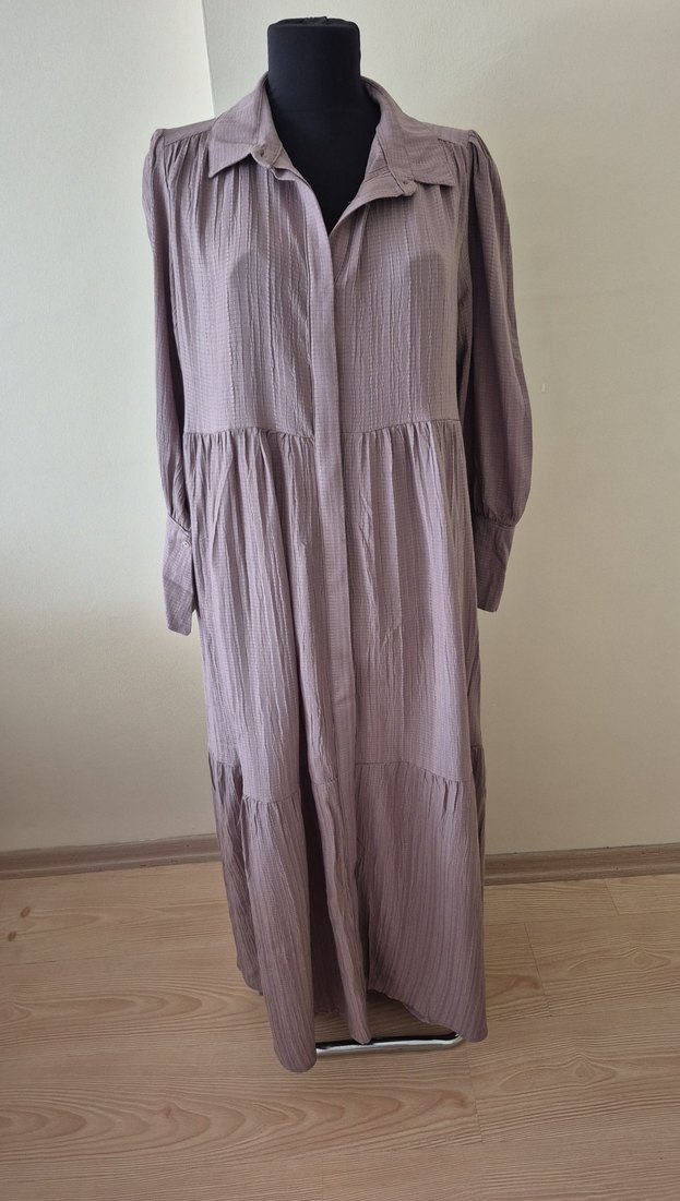 Yumuşak keten kumaştan, pilili ve bej-gri tonlarda, notched lapel yakalı bol kesim uzun elbise. Rahat ve bohem tarz için uygundur.