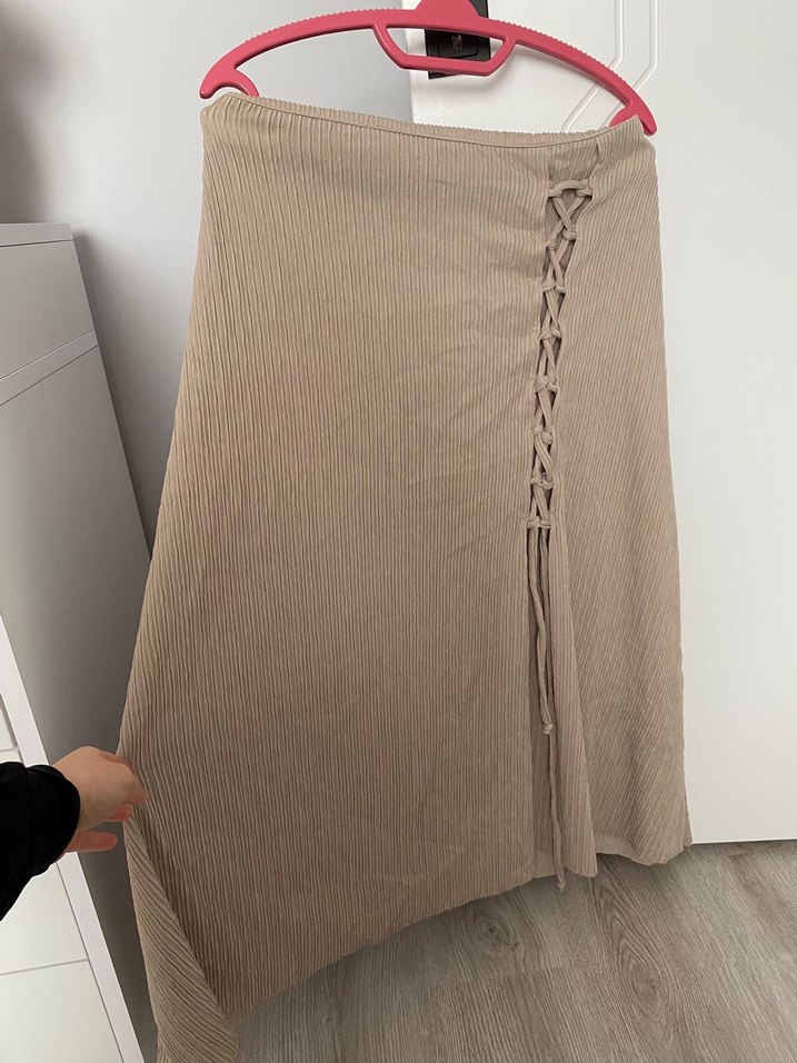 Bej renk, uzun boy, pilili ve bol kesim keten kumaştan yapılmış etek. Yanında şık bağcık detayı bulunur, bohem tarzı için uygun.