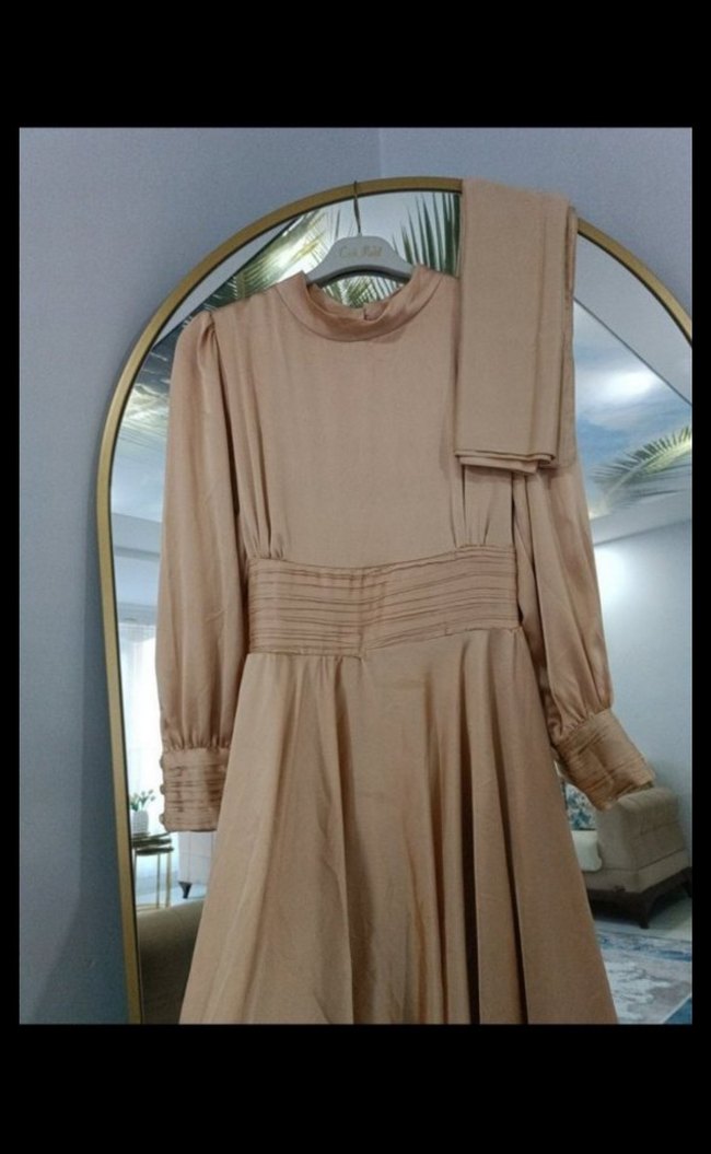 Bej renkli, pilili ve yüksek yakalı uzun elbise. İpek gibi kumaştan, uzun kollu ve rahat kesime sahip, modern klasik tarzda. ✨