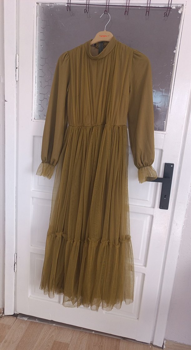 Bej renkte, yüksek yakalı, pilili ve uzun kollu uzun elbise. Yumuşak keten kumaştan, bol kesim ve parlak görünüme sahip, düğünler için uygun.