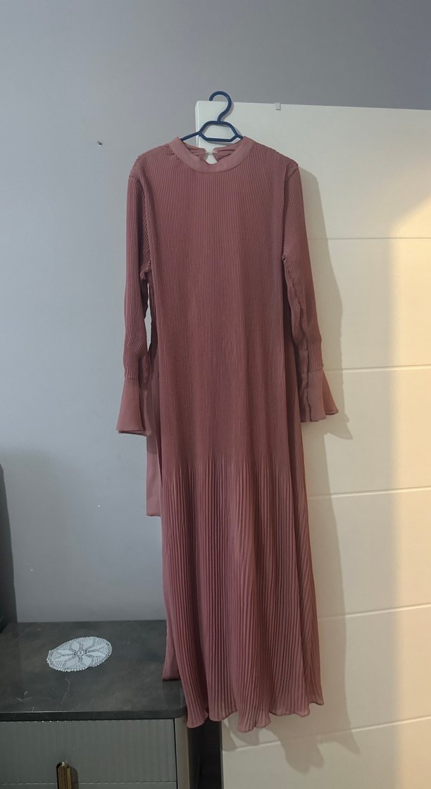 Bej renkli, yüksek yakalı, uzun kollu ve pilili etekli uzun kadın elbisesi. Rahat kesimli, sentetik yumuşak kumaştan, günlük kullanıma uygun minimal ve sade tarzda.