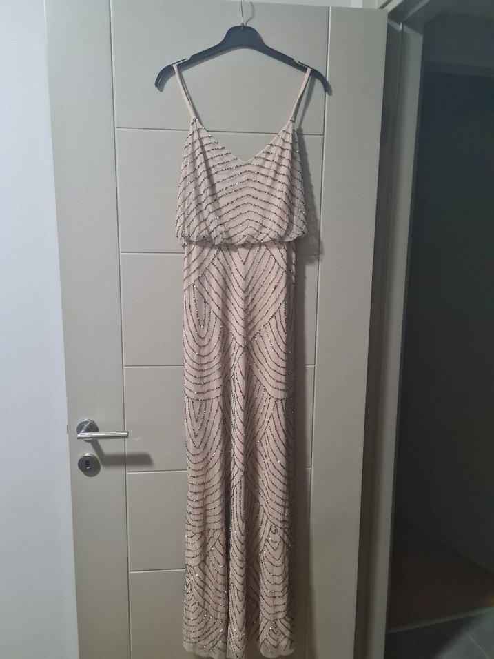 Bej renkli, V yakalı ve ince askılı uzun abiye elbise. Pilili detayları ve yumuşak sentetik kumaşı ile bol kesim, düğünler için uygun.