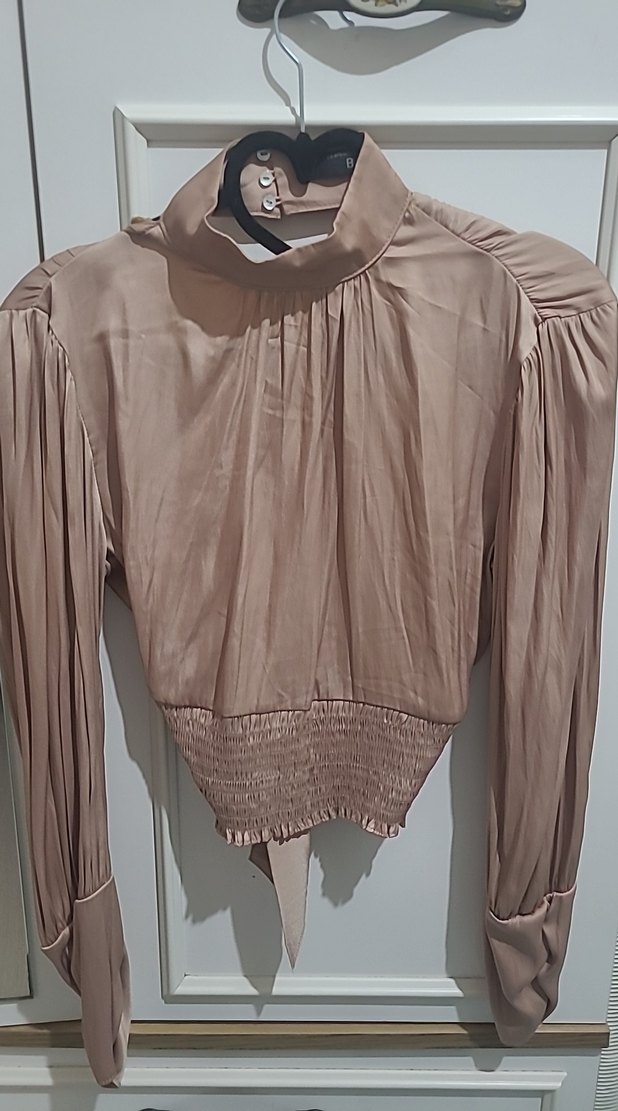 Bej renkte, uzun kollu, yüksek yakalı ve pilili detaylara sahip, vücuda oturan, ipeksi dokulu midi uzunlukta kadın bluz. Günlük kullanıma uygun, Paris tarzı şık bir parça.