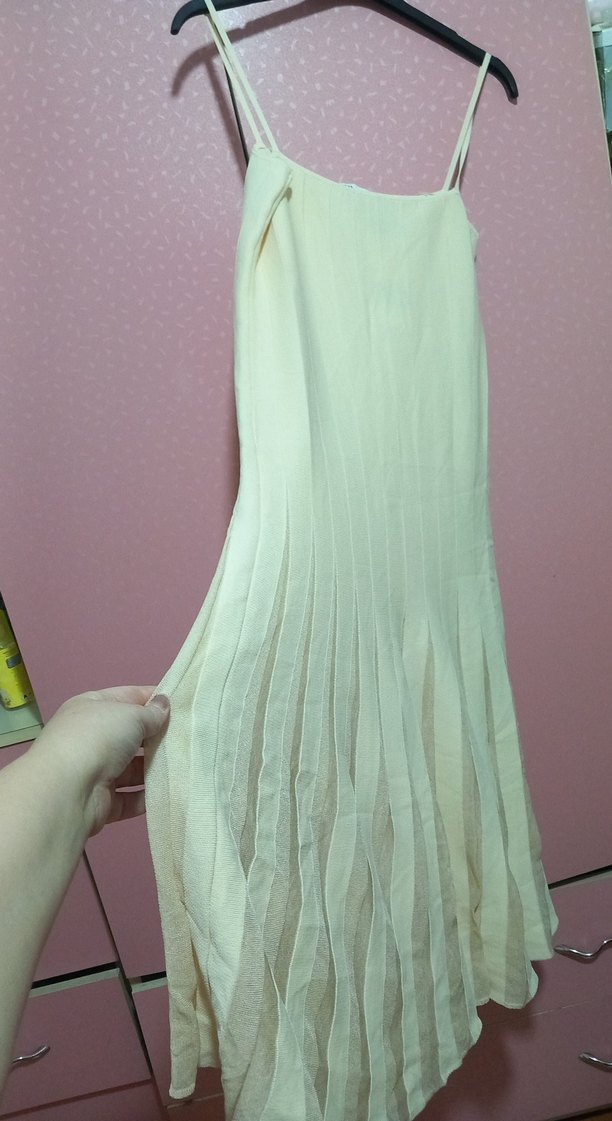 Bej renkte, askılı ve piliseli uzun elbise. Sentetik yumuşak kumaştan, bohem vintage tarzında, düğün için uygun.