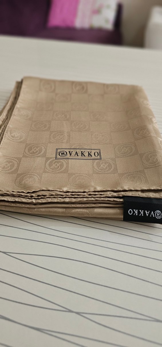 Bej renk, parlak sentetik kumaştan yapılmış, piliseli detaylara sahip kadın şalı. Vakko logosu bulunmaktadır ve klasik iş tarzına uygundur.