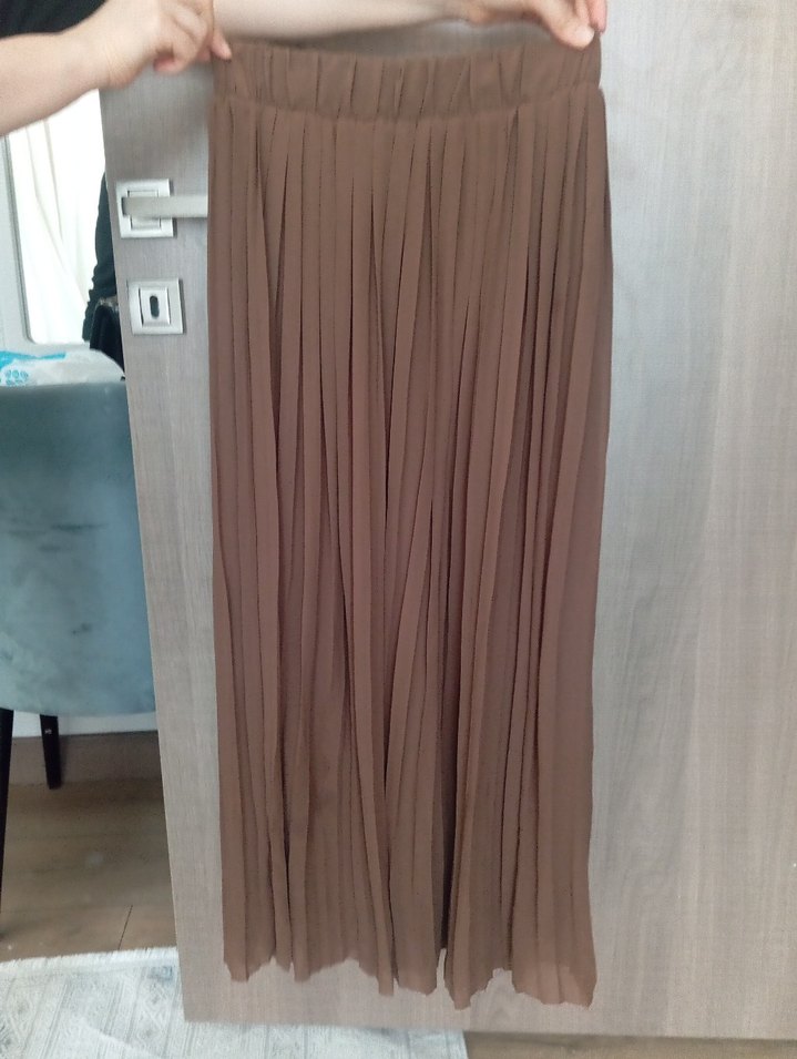 Bej renkte, piliseli ve bol kesim uzun etek. Sentetik kumaştan yapılmış, desen içermeyen sade tasarımıyla minimal ve bohem tarzlara uygundur.