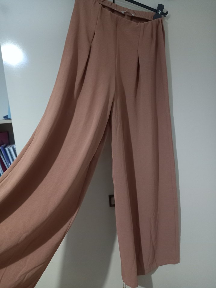 Bej renkte, piliseli ve bol kesim uzun kadın kumaş pantolon. Yumuşak ve ipeksi dokusu, minimalist sokak stiliyle günlük kullanıma uygundur.