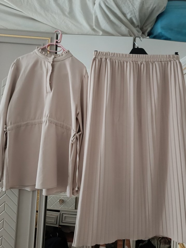 Bej renkte, uzun kollu, piliseli eteğe sahip bol kesim kadın takımı. Üst kısmı yuvarlak yaka ve sade tasarımlıdır, günlük kullanım için uygundur.